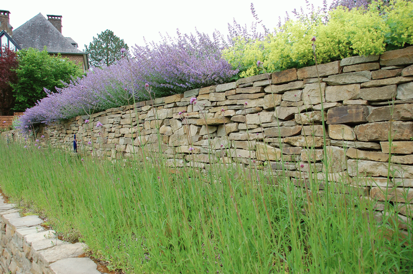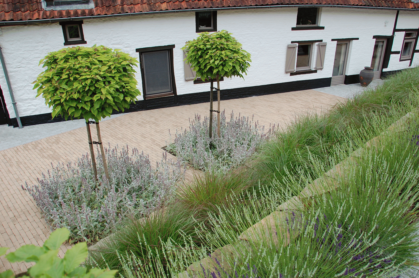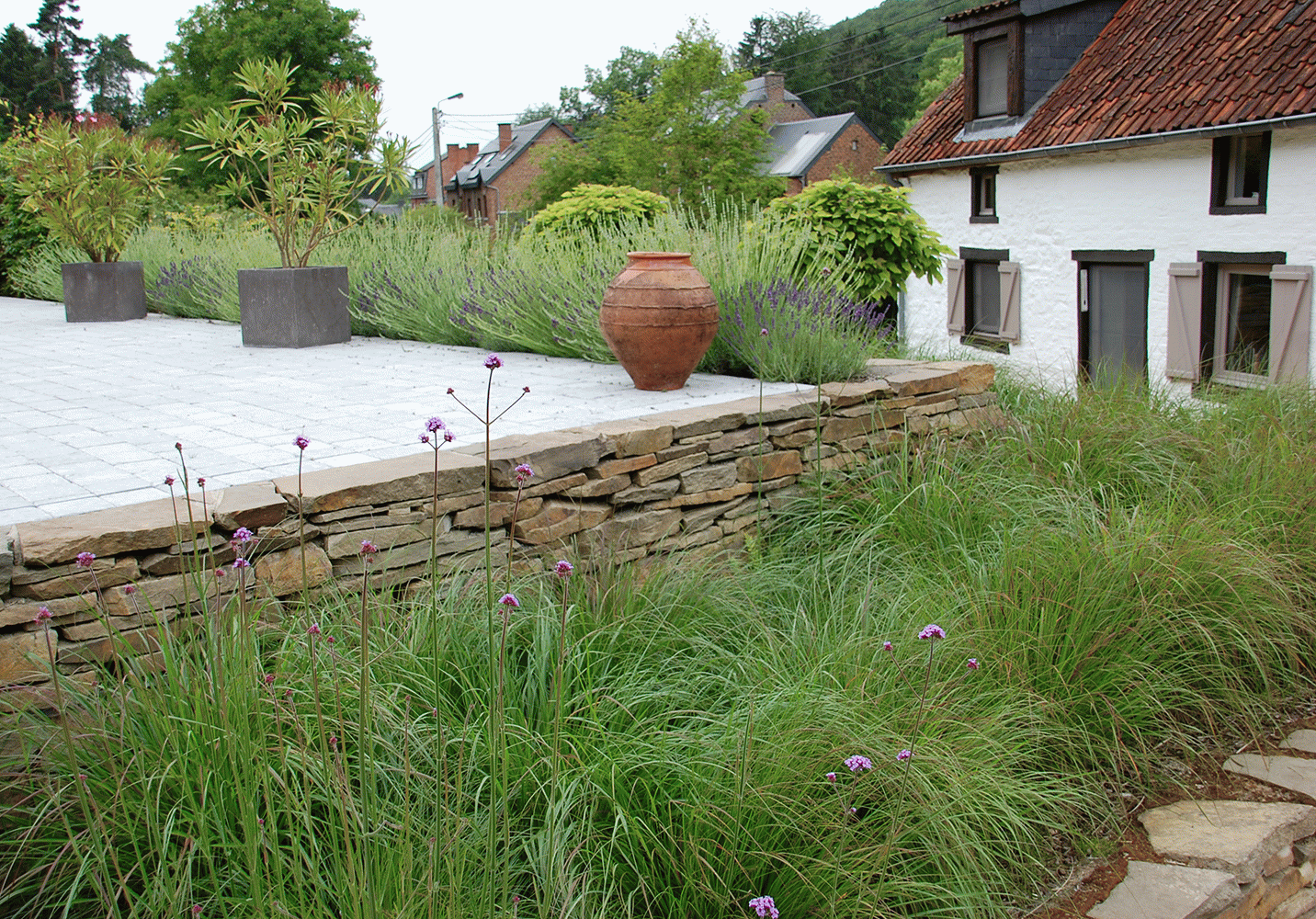 Pour Jean Modave, la réalisation de ce jardin représentait un sacré défi. Après avoir racheté la parcelle mitoyenne, les occupants des lieux avaient exprimé le souhait de disposer d’une terrasse offrant davantage d’espace. Le problème résidait essentiellement dans la présence du talus qui s’élevait abruptement à l’arrière de la maison, laissant peu de place pour une terrasse large et confortable.