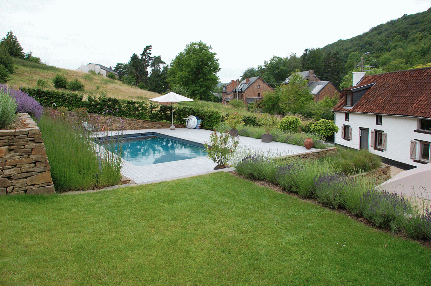 Compte tenu de la déclivité du terrain, d’importants travaux d’aménagement et surtout de terrassement étaient à prévoir. La terrasse devait gagner en étendue, ce qui impliquait l’excavation d’une partie du talus. Une autre demande des propriétaires des lieux était la création d’une piscine qu’ils souhaitaient invisible depuis la terrasse.