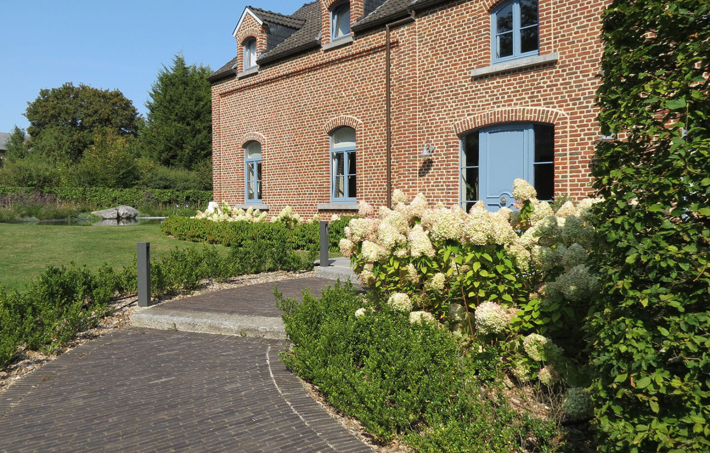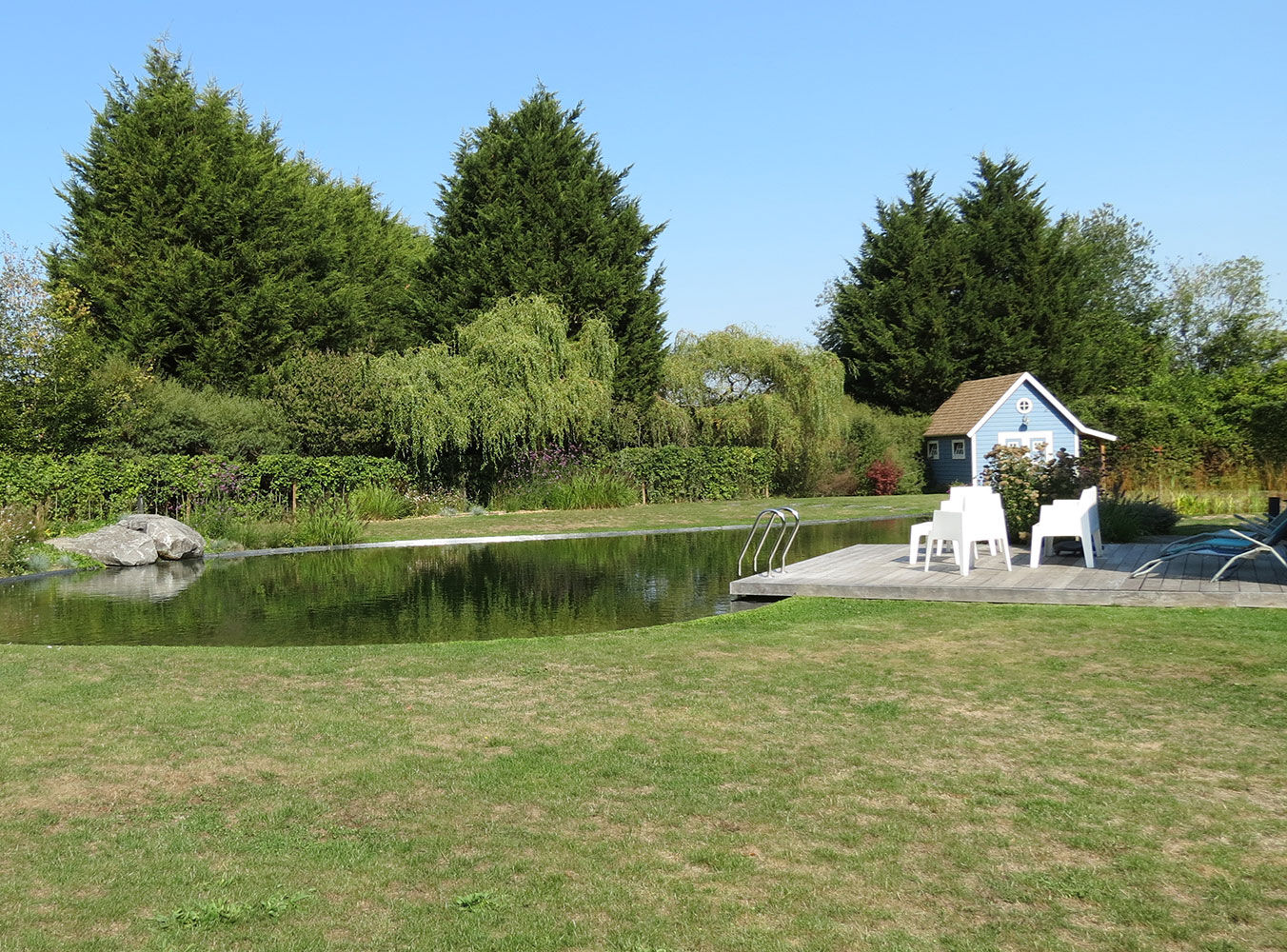 « On a rhabillé tout le périmètre autour de la pièce d’eau. On a refait la ceinture végétale avec des haies pour masquer les vis-à-vis de maisons. On a alors planté de gros sujets au feuillage persistant, et même un arbre. On a également replanté tout autour de la maison. On a choisi des plantes indigènes, car on privilégie les plantes qui poussent bien chez nous. On n’est pas du genre à mettre des palmiers ».