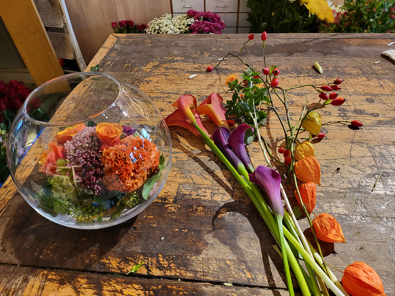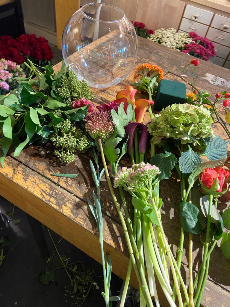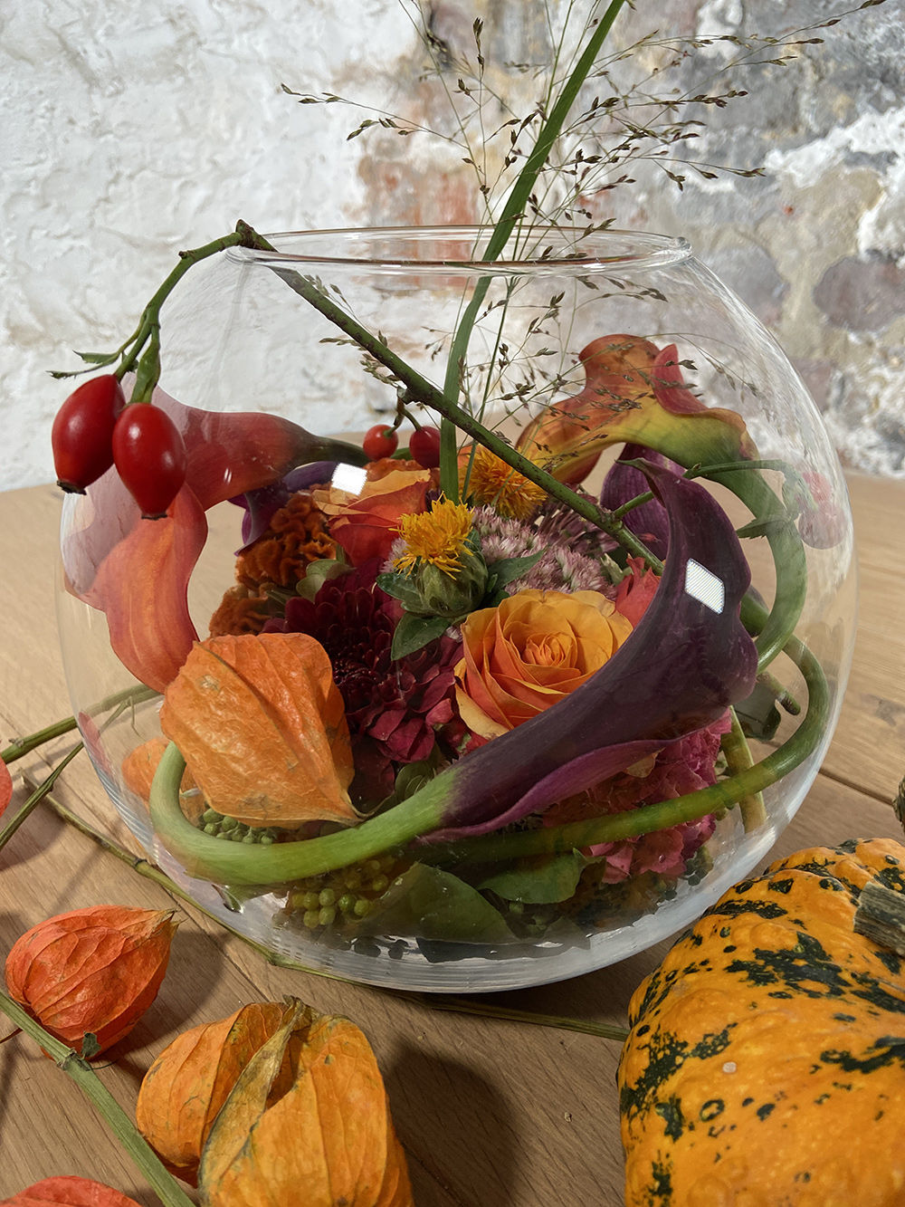 - Des fleurs 100% belges et de saison : lierre, hortensia, sedum, roses, chrysanthèmes, callas, allium, célosie, carthamus, œillet, physalis, baies de rosiers, graminée « Red Squaw ».
