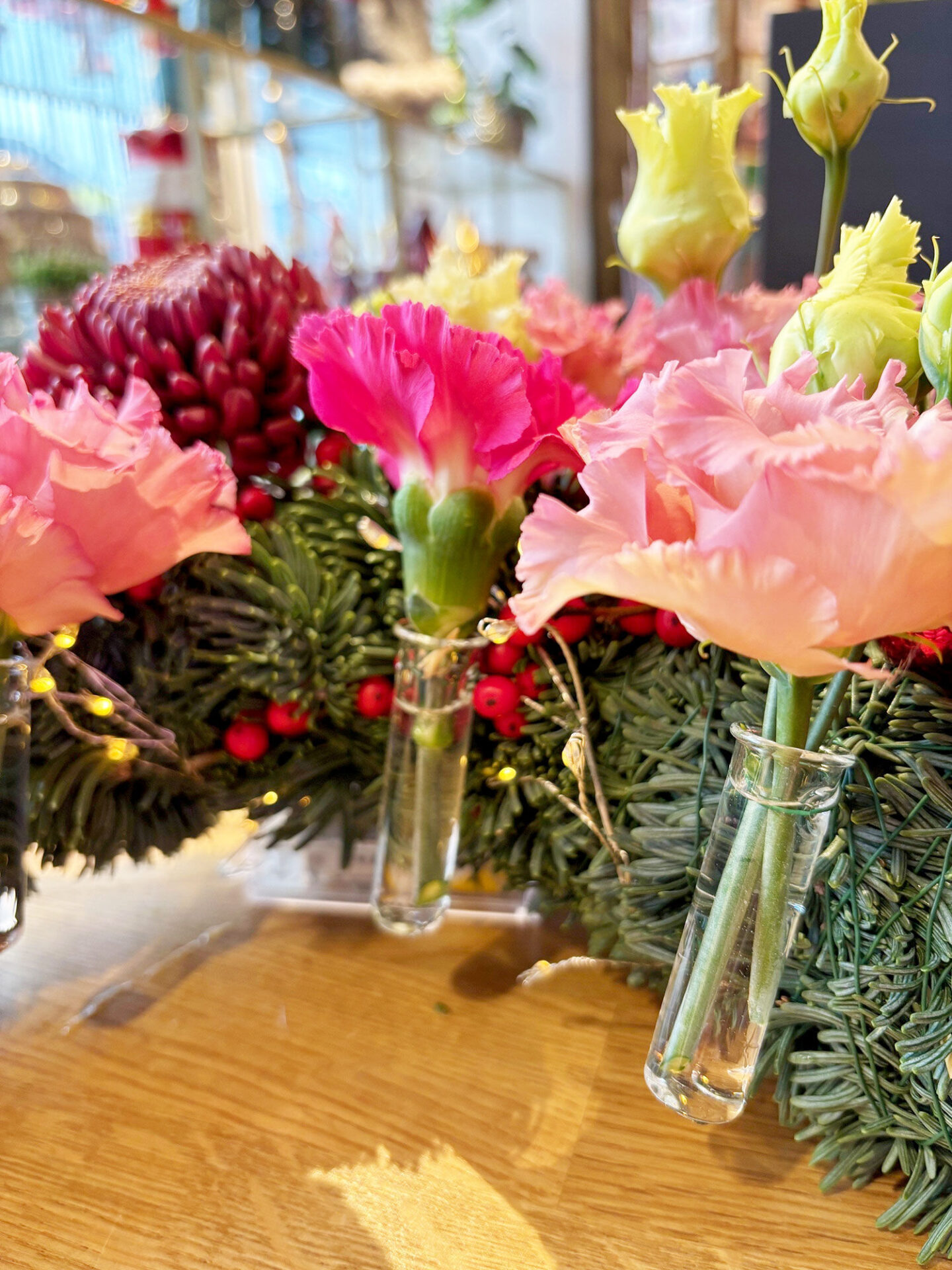 7. Remplissez les éprouvettes d’eau et placez-y les fleurs de votre choix (ici des chrysanthèmes bigoudi, des lisianthus corelli coral et des dianthus cherry damascus).