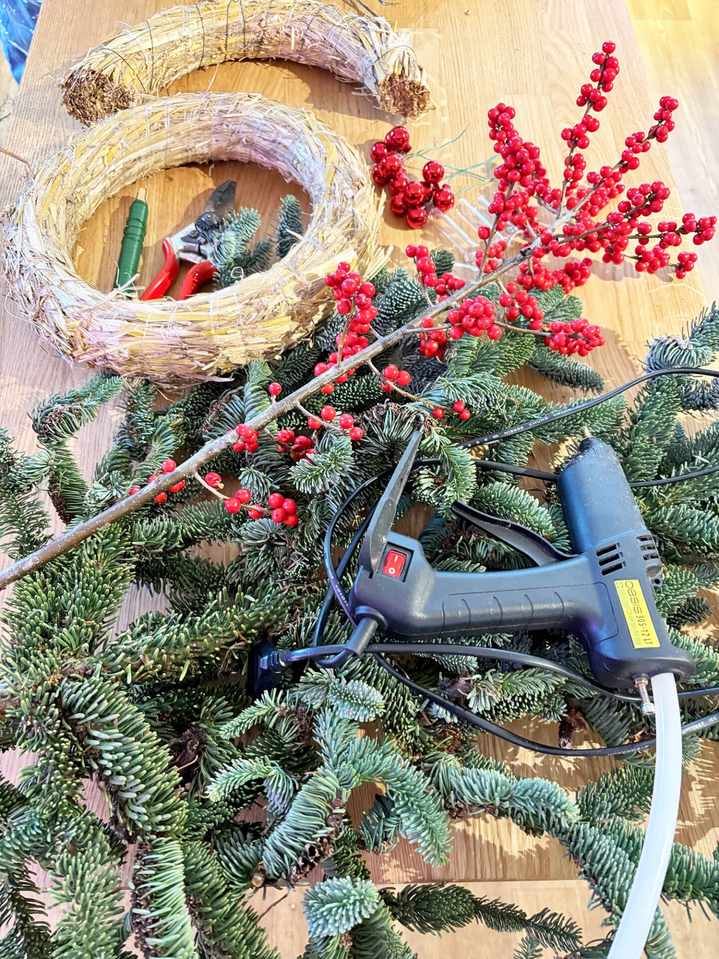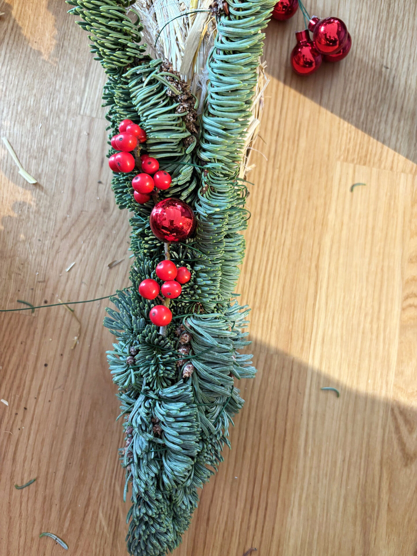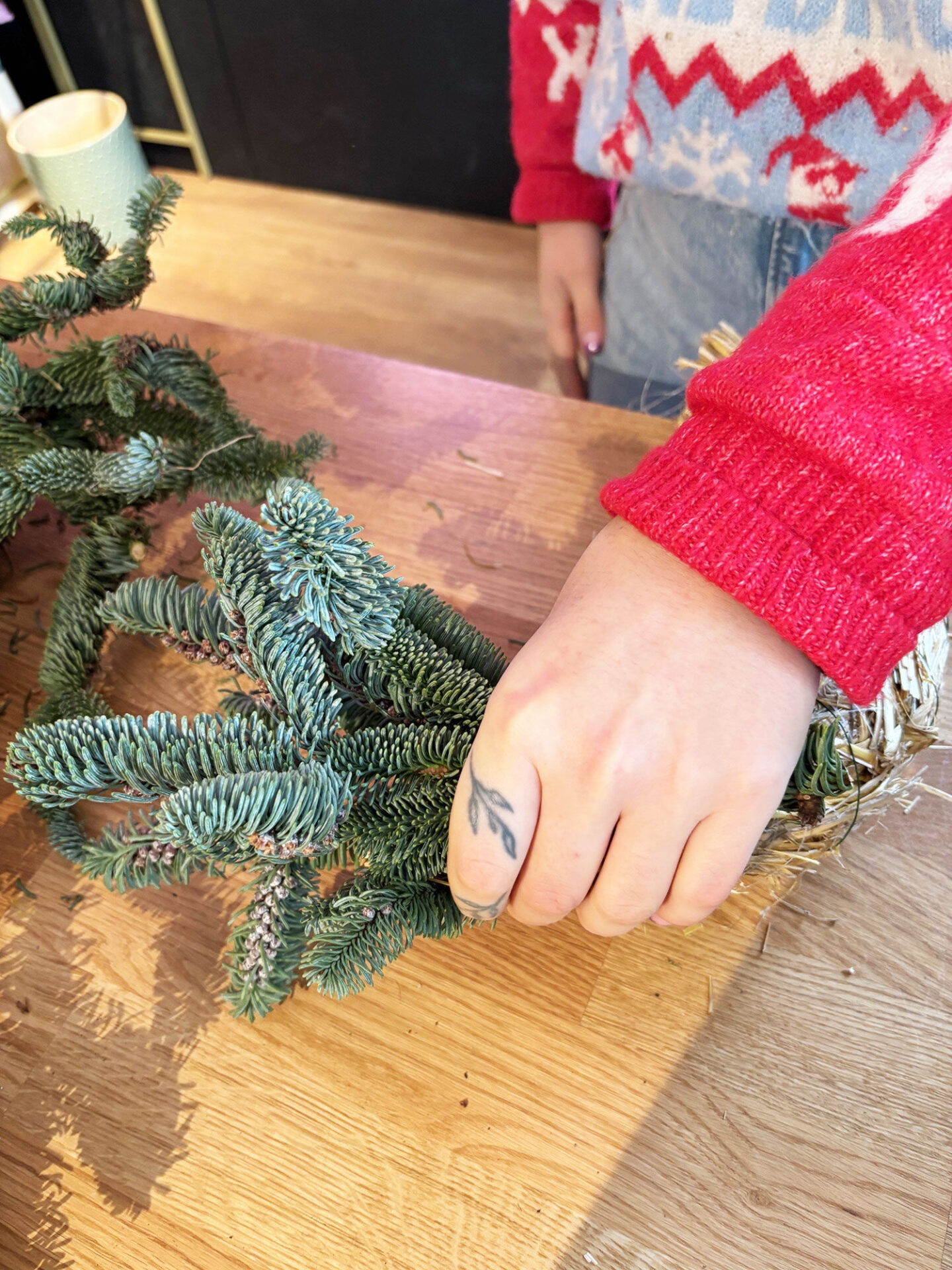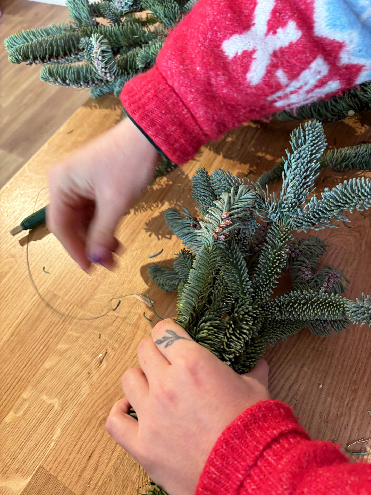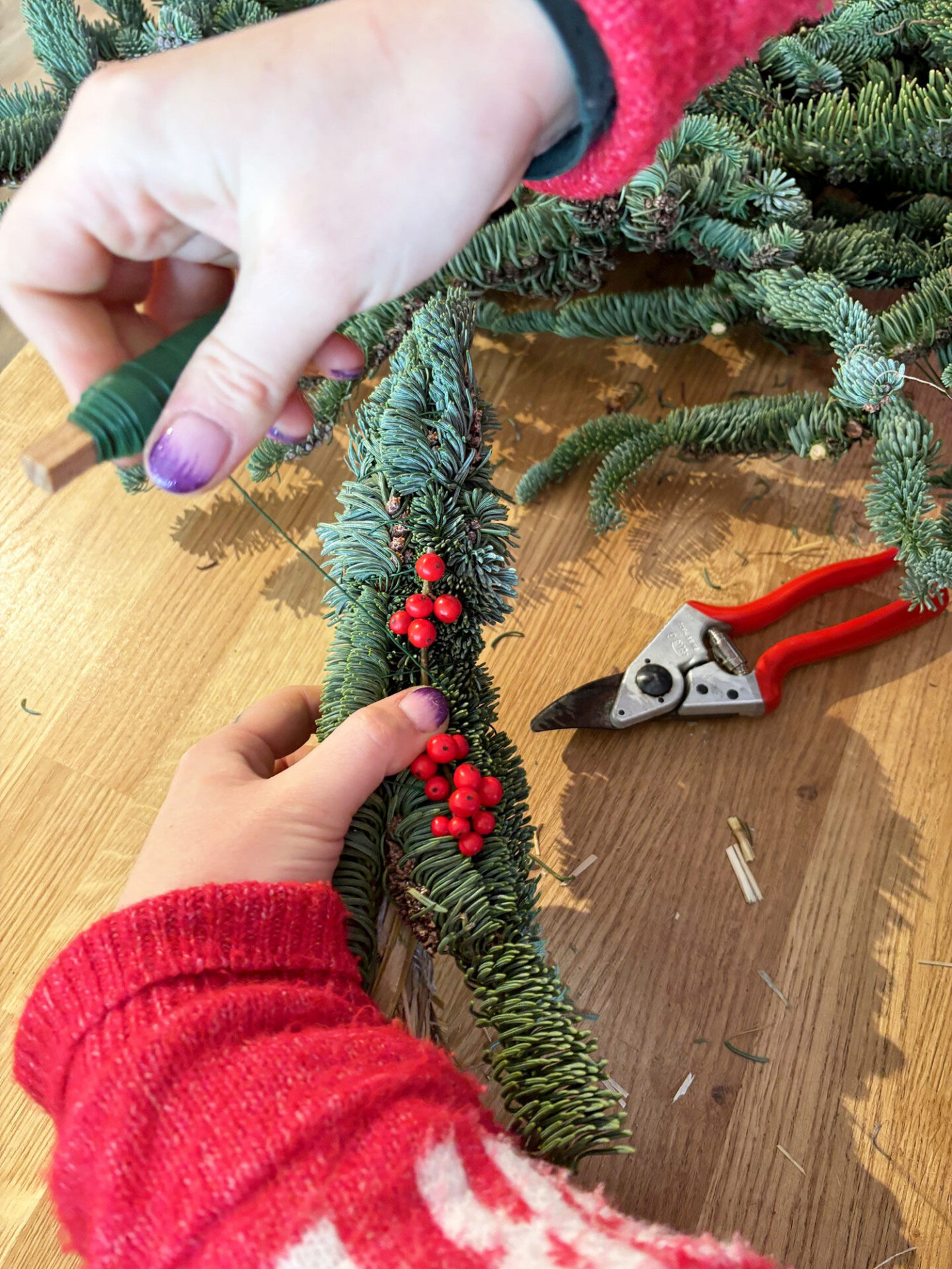 3. Piquez le sapin et les branches de houx dans la demi-couronne pour la couvrir entièrement ; attachez-les avec le fil de fer ou du ‘floratape’ si nécessaire.