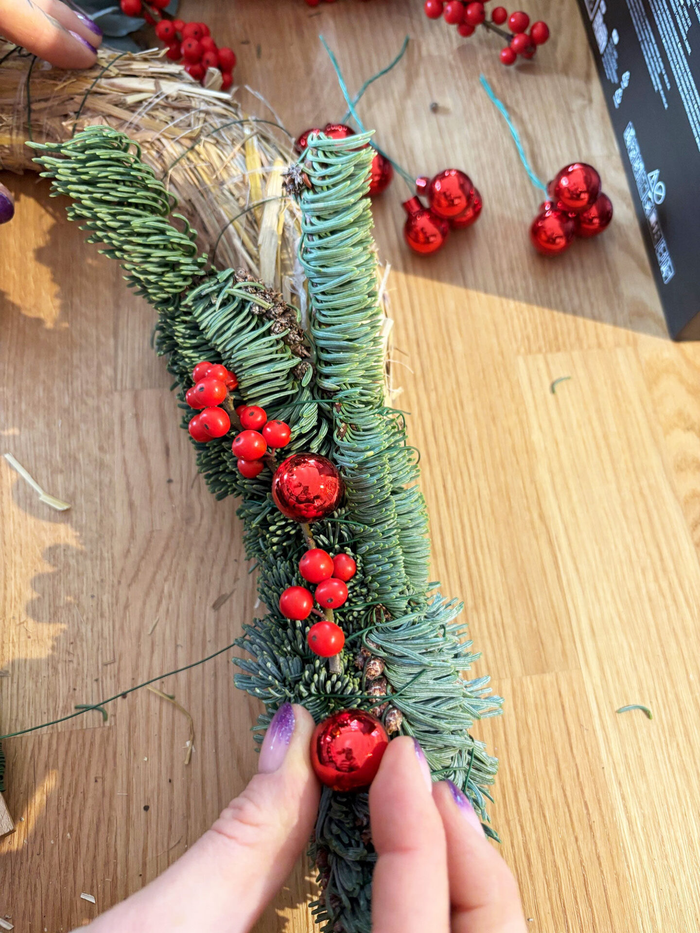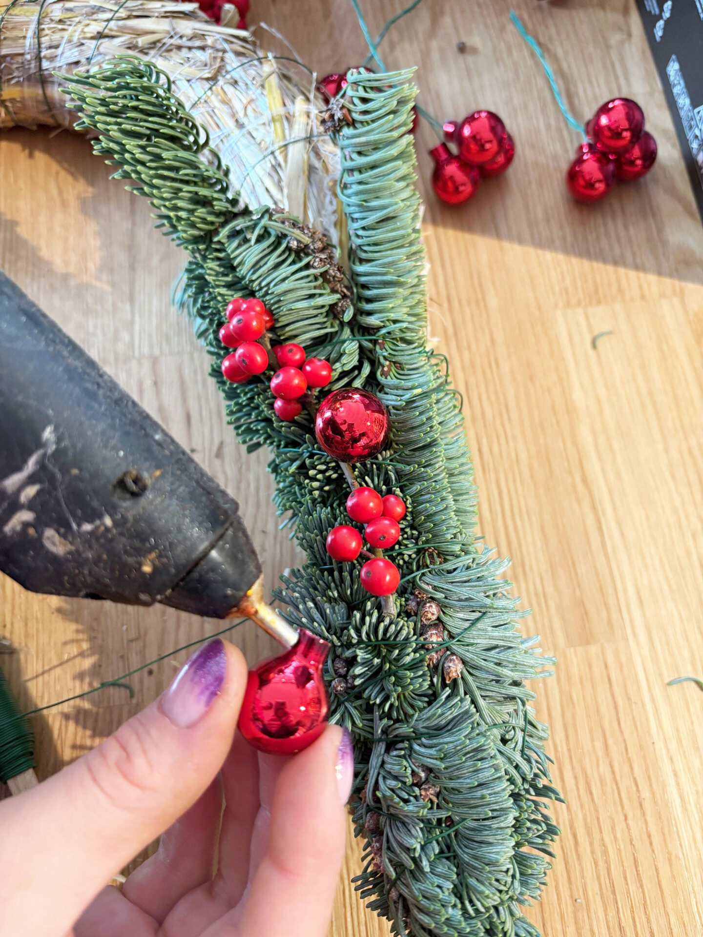 6. Utilisez le pistolet à colle pour fixer les boules de Noël ça et là sur la composition.